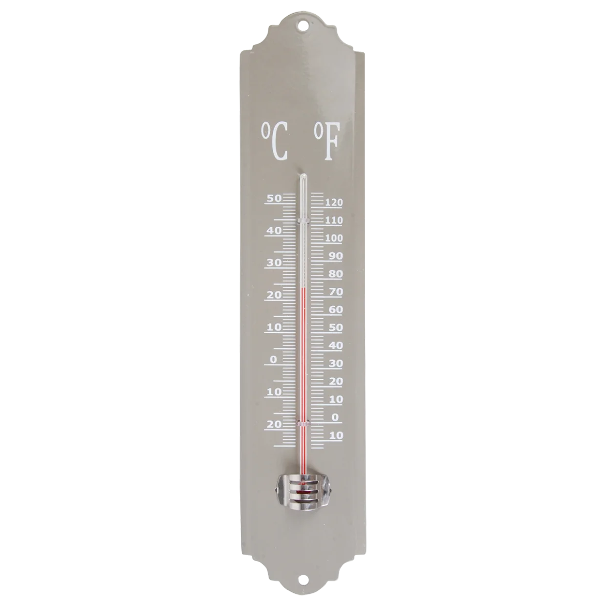 Цей металевий термометр показує температуру за Цельсієм і Фаренгейтом і підходить для використання всередині та зовні. Термометр легко кріпиться на стіну. Доступний у кольорах: сірий, білий та зелений. Термометр показує температуру від -25°C до +55°C.