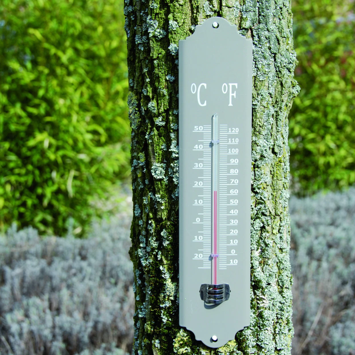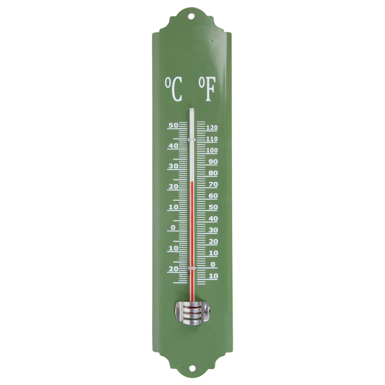 Цей металевий термометр показує температуру за Цельсієм і Фаренгейтом і підходить для використання всередині та зовні. Термометр легко кріпиться на стіну. Доступний у кольорах: сірий, білий та зелений. Термометр показує температуру від -25°C до +55°C.