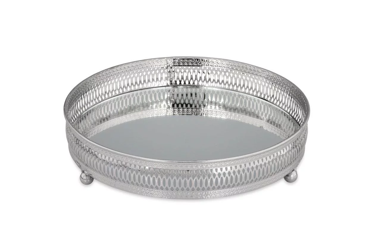 Стильний круглий піднос з декоративними gallery-бортиками стане ефектним елементом сервірування та декору. Дзеркальне дно красиво відбиває предмети, посилюючи їхню презентацію, а невеликі сферичні ніжки додають стійкості та вишуканості.